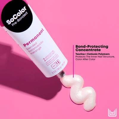 The new SoColor and SoColor Sync formulas have been enhanced with our exclusive Bond-Protecting Concentrate. This unique blend of taurine and cationic polymers act as an internal bond-support system to strengthen and protect the strands during the colouring process. The pre-bonded formula helps to maintain the integrity of the hair, colour after colour*.